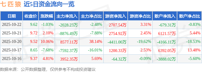 证券之星消息,截至2025年10月22日收盘,七 匹 狼(002029)报收于9.62元,下跌1.03%,换手率12.61%,成交量83.93万手,成交额8.19亿元。