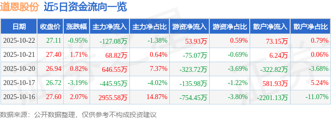 证券之星消息,截至2025年10月22日收盘,道恩股份(002838)报收于27.11元,下跌0.95%,换手率0.81%,成交量3.4万手,成交额9217.32万元。