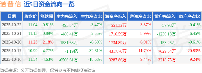 证券之星消息,截至2025年10月22日收盘,诺 普 信(002215)报收于11.04元,下跌0.81%,换手率1.63%,成交量12.81万手,成交额1.42亿元。