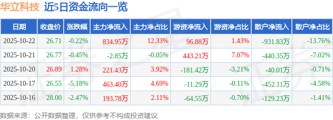 证券之星消息,截至2025年10月22日收盘,华立科技(301011)报收于26.71元,下跌0.22%,换手率1.81%,成交量2.53万手,成交额6770.25万元。