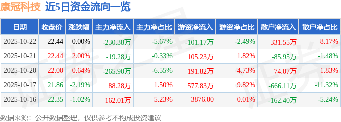 10月22日的资金流向数据方面,主力资金净流出230.38万元,占总成交额5.67%,游资资金净流出101.17万元,占总成交额2.49%,散户资金净流入331.55万元,占总成交额8.17%。