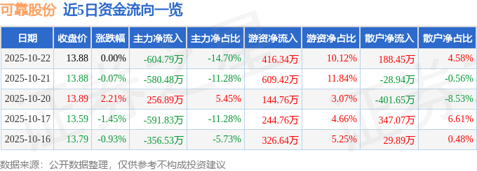 证券之星消息,截至2025年10月22日收盘,可靠股份(301009)报收于13.88元,上涨0.0%,换手率1.96%,成交量2.96万手,成交额4113.69万元。
