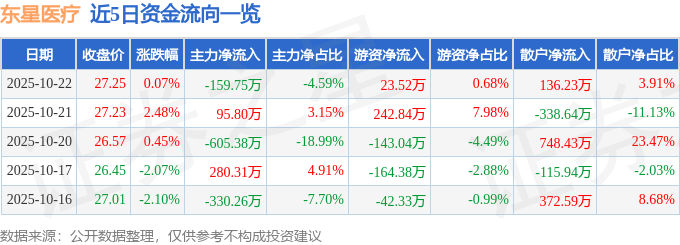 证券之星消息,截至2025年10月22日收盘,东星医疗(301290)报收于27.25元,上涨0.07%,换手率1.87%,成交量1.27万手,成交额3480.94万元。