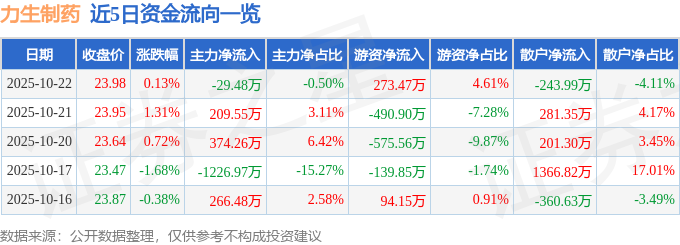 证券之星消息,截至2025年10月22日收盘,力生制药(002393)报收于23.98元,上涨0.13%,换手率0.99%,成交量2.48万手,成交额5932.25万元。