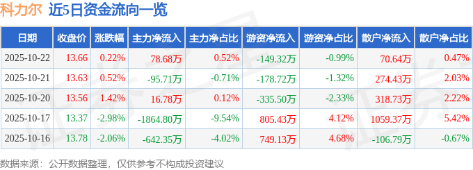 证券之星消息,截至2025年10月22日收盘,科力尔(002892)报收于13.66元,上涨0.22%,换手率2.3%,成交量11.11万手,成交额1.52亿元。
