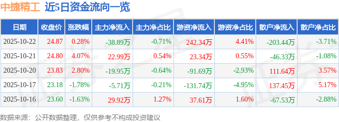 证券之星消息,截至2025年10月22日收盘,中捷精工(301072)报收于24.87元,上涨0.28%,换手率3.25%,成交量2.19万手,成交额5490.57万元。