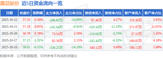 证券之星消息,截至2025年10月22日收盘,嘉益股份(301004)报收于57.35元,上涨0.3%,换手率0.26%,成交量3576.0手,成交额2049.05万元。