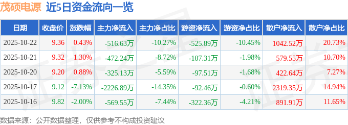 证券之星消息,截至2025年10月22日收盘,茂硕电源(002660)报收于9.36元,上涨0.43%,换手率1.56%,成交量5.37万手,成交额5030.15万元。