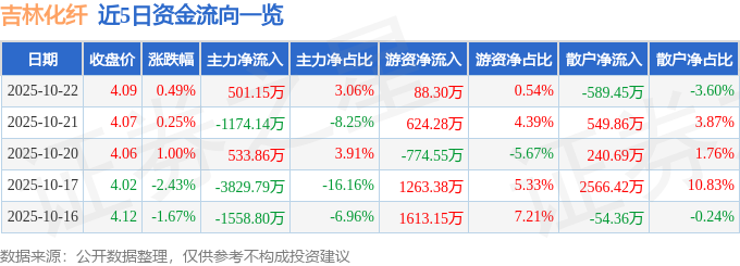 证券之星消息,截至2025年10月22日收盘,吉林化纤(000420)报收于4.09元,上涨0.49%,换手率1.62%,成交量39.8万手,成交额1.64亿元。