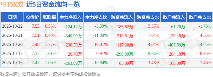 证券之星消息,截至2025年10月22日收盘,*ST双成(002693)报收于7.55元,上涨0.53%,换手率1.11%,成交量4.57万手,成交额3458.13万元。