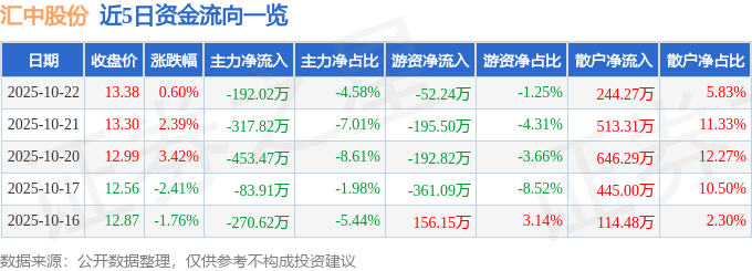 证券之星消息,截至2025年10月22日收盘,汇中股份(300371)报收于13.38元,上涨0.6%,换手率2.33%,成交量3.13万手,成交额4192.99万元。