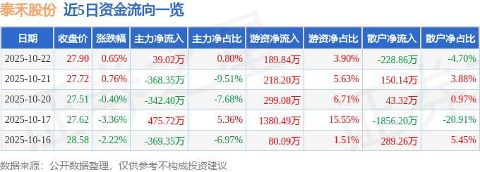 证券之星消息,截至2025年10月22日收盘,泰禾股份(301665)报收于27.9元,上涨0.65%,换手率4.54%,成交量1.74万手,成交额4872.84万元。