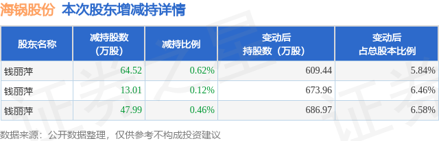 证券之星消息,10月22日海锅股份发布公告《海锅股份:关于持股5%以上股东减持股份的预披露公告》,其股东钱丽萍于2025年8月7日至2025年10月21日间合计减持125.52万股,占公司目前总股本的1.2027%,变动期间该股股价下跌4.95%,截止10月21日收盘报27.66元。