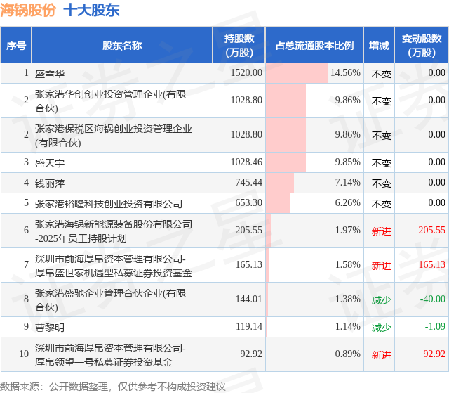 根据海锅股份2025年中报公布的十大股东详情如下: