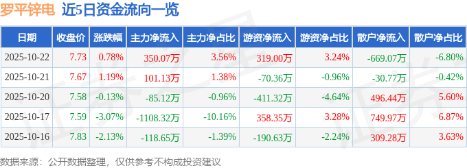 证券之星消息,截至2025年10月22日收盘,罗平锌电(002114)报收于7.73元,上涨0.78%,换手率3.96%,成交量12.8万手,成交额9833.22万元。