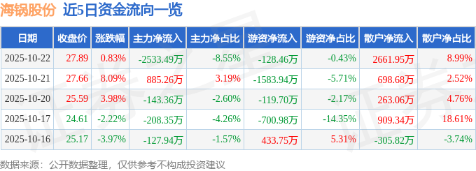 证券之星消息,截至2025年10月22日收盘,海锅股份(301063)报收于27.89元,上涨0.83%,换手率10.45%,成交量10.49万手,成交额2.96亿元。