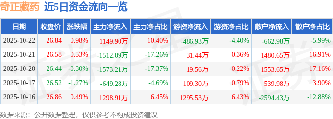 证券之星消息,截至2025年10月22日收盘,奇正藏药(002287)报收于26.84元,上涨0.98%,换手率0.72%,成交量4.13万手,成交额1.11亿元。