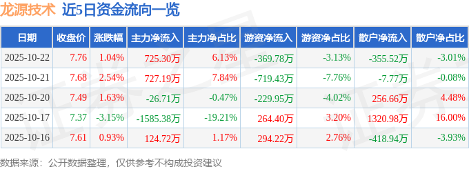 证券之星消息,截至2025年10月22日收盘,龙源技术(300105)报收于7.76元,上涨1.04%,换手率2.96%,成交量15.27万手,成交额1.18亿元。