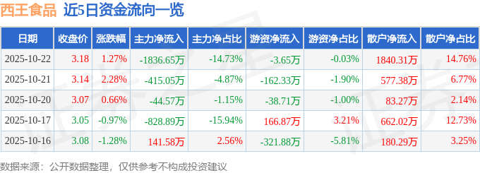 证券之星消息,截至2025年10月22日收盘,西王食品(000639)报收于3.18元,上涨1.27%,换手率3.62%,成交量39.12万手,成交额1.25亿元。