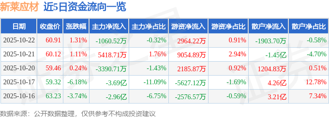 证券之星消息,截至2025年10月22日收盘,新莱应材(300260)报收于60.91元,上涨1.31%,换手率19.1%,成交量54.95万手,成交额32.72亿元。