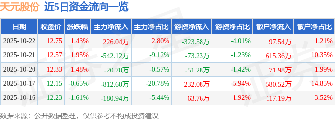 证券之星消息,截至2025年10月22日收盘,天元股份(003003)报收于12.75元,上涨1.43%,换手率5.38%,成交量6.33万手,成交额8065.85万元。