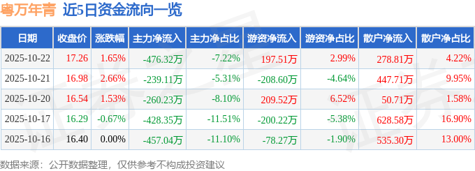 证券之星消息,截至2025年10月22日收盘,粤万年青(301111)报收于17.26元,上涨1.65%,换手率2.4%,成交量3.83万手,成交额6599.06万元。