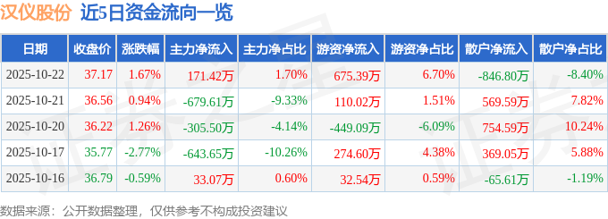 证券之星消息,截至2025年10月22日收盘,汉仪股份(301270)报收于37.17元,上涨1.67%,换手率2.88%,成交量2.72万手,成交额1.01亿元。