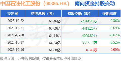 证券之星消息,10月22日南向资金减持2314.4万股中国石油化工股份(00386.HK)。近5个交易日中,获南向资金减持的有4天,累计净减持1.41亿股。近20个交易日中,获南向资金减持的有18天,累计净减持3.71亿股。截至目前,南向资金持有中国石油化工股份(00386.HK)63.46亿股,占公司已发行普通股的26.49%。