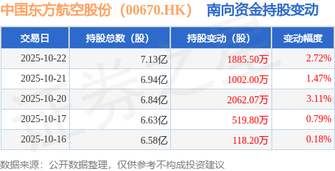 证券之星消息,10月22日南向资金增持1885.5万股中国东方航空股份(00670.HK)。近5个交易日中,获南向资金增持的有5天,累计净增持5587.56万股。近20个交易日中,获南向资金增持的有17天,累计净增持9877.9万股。截至目前,南向资金持有中国东方航空股份(00670.HK)7.13亿股,占公司已发行普通股的13.76%。