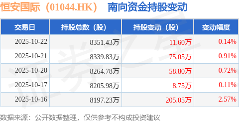 证券之星消息,10月22日南向资金增持11.6万股恒安国际(01044.HK)。近5个交易日中,获南向资金增持的有5天,累计净增持359.25万股。近20个交易日中,获南向资金增持的有12天,累计净增持305.05万股。截至目前,南向资金持有恒安国际(01044.HK)8351.43万股,占公司已发行普通股的7.18%。