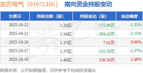 证券之星消息,10月22日南向资金减持175.98万股东方电气(01072.HK)。近5个交易日中,获南向资金减持的有3天,累计净减持455.94万股。近20个交易日中,获南向资金增持的有9天,累计净增持680.56万股。截至目前,南向资金持有东方电气(01072.HK)1.32亿股,占公司已发行普通股的32.34%。