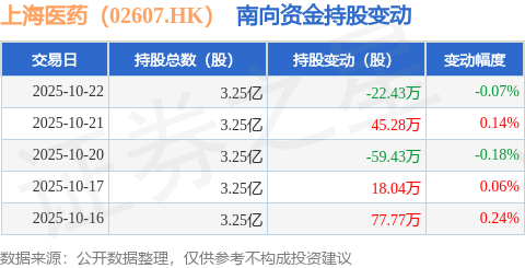 证券之星消息,10月22日南向资金减持22.43万股上海医药(02607.HK)。近5个交易日中,获南向资金增持的有3天,累计净增持59.23万股。近20个交易日中,获南向资金增持的有13天,累计净增持652.58万股。截至目前,南向资金持有上海医药(02607.HK)3.25亿股,占公司已发行普通股的35.35%。