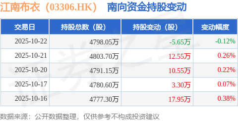 证券之星消息,10月22日南向资金减持5.65万股江南布衣(03306.HK)。近5个交易日中,获南向资金增持的有4天,累计净增持38.7万股。近20个交易日中,获南向资金增持的有16天,累计净增持308.35万股。截至目前,南向资金持有江南布衣(03306.HK)4798.05万股,占公司已发行普通股的9.24%。