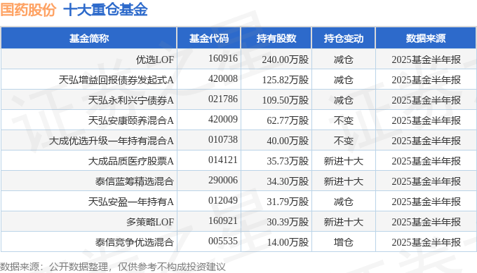 持有国药股份最多的基金为优选LOF,目前规模为12.53亿元,最新净值4.312(10月22日),较上一交易日下跌0.99%,近一年上涨11.64%。该基金现任基金经理为戴军。