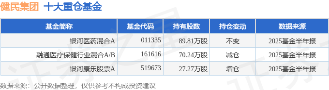 持有健民集团最多的基金为银河医药混合A,目前规模为4.91亿元,最新净值0.5919(10月22日),较上一交易日下跌1.33%,近一年上涨13.94%。该基金现任基金经理为方伟。