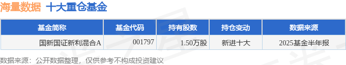 持有海量数据最多的基金为国新国证新利混合A,目前规模为0.19亿元,最新净值0.853(10月21日),较上一交易日上涨1.07%,近一年上涨5.31%。该基金现任基金经理为张洪磊。