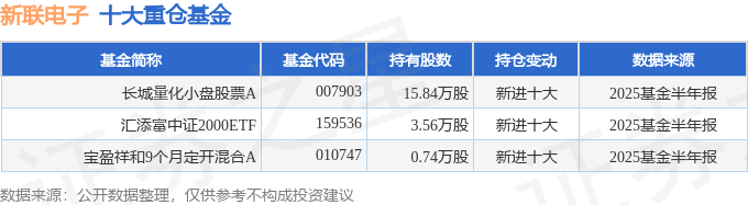 持有新联电子最多的基金为长城量化小盘股票A,目前规模为0.81亿元,最新净值1.4087(10月21日),较上一交易日上涨1.03%,近一年上涨25.89%。该基金现任基金经理为雷俊。