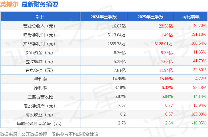 据证券之星公开数据整理,近期英搏尔(300681)发布2025年三季报。截至本报告期末,公司营业总收入23.58亿元,同比上升46.7%,归母净利润1.49亿元,同比上升191.18%。按单季度数据看,第三季度营业总收入9.89亿元,同比上升69.4%,第三季度归母净利润1.12亿元,同比上升580.62%。本报告期英搏尔应收账款上升,应收账款同比增幅达41.79%。