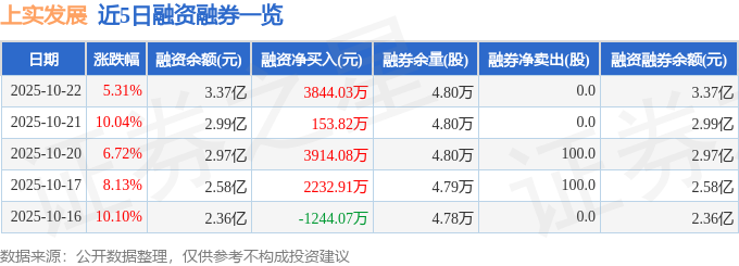 上实发展融资融券信息显示,融资方面,当日融资买入1.65亿元,融资偿还1.27亿元,融资净买入3844.03万元,连续3日净买入累计7911.92万元。融券方面,融券卖出0.0股,融券偿还0.0股,融券余量4.8万股,融券余额37.1万元。融资融券余额3.37亿元。