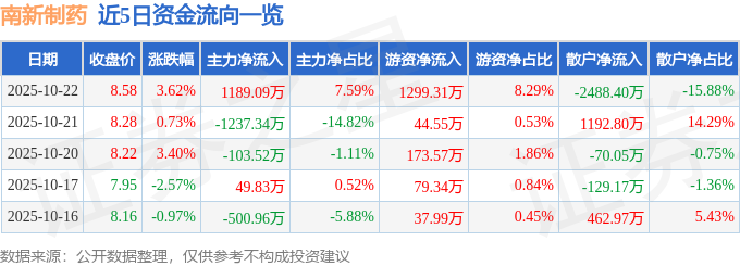 证券之星消息,截至2025年10月22日收盘,南新制药(688189)报收于8.58元,上涨3.62%,换手率6.58%,成交量18.07万手,成交额1.57亿元。