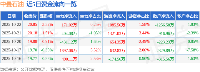 证券之星消息,截至2025年10月22日收盘,中曼石油(603619)报收于20.85元,上涨3.32%,换手率7.22%,成交量33.39万手,成交额6.87亿元。