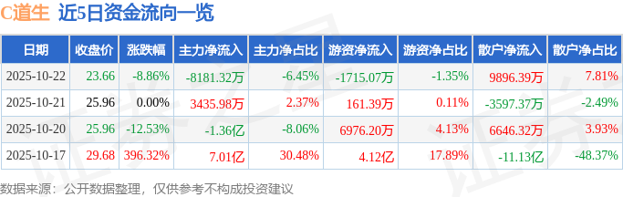 证券之星消息,截至2025年10月22日收盘,C道生(601026)报收于23.66元,下跌8.86%,换手率48.72%,成交量52.22万手,成交额12.68亿元。