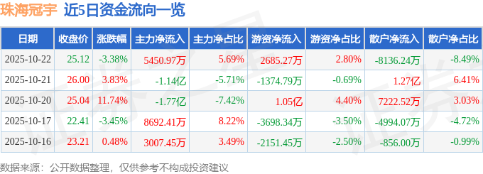 10月22日的资金流向数据方面,主力资金净流入5450.97万元,占总成交额5.69%,游资资金净流入2685.27万元,占总成交额2.8%,散户资金净流出8136.24万元,占总成交额8.49%。