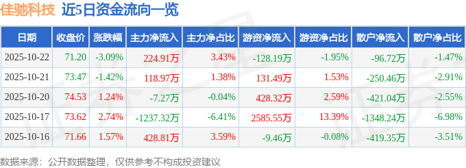 10月22日的资金流向数据方面,主力资金净流入224.91万元,占总成交额3.43%,游资资金净流出128.19万元,占总成交额1.95%,散户资金净流出96.72万元,占总成交额1.47%。