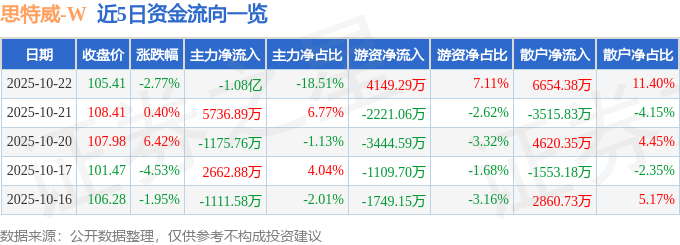 10月22日的资金流向数据方面,主力资金净流出1.08亿元,占总成交额18.51%,游资资金净流入4149.29万元,占总成交额7.11%,散户资金净流入6654.38万元,占总成交额11.4%。