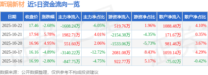 证券之星消息,截至2025年10月22日收盘,斯瑞新材(688102)报收于17.46元,下跌2.68%,换手率2.07%,成交量15.12万手,成交额2.66亿元。