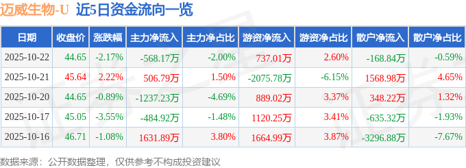 证券之星消息,截至2025年10月22日收盘,迈威生物(688062)报收于44.65元,下跌2.17%,换手率3.08%,成交量6.3万手,成交额2.84亿元。