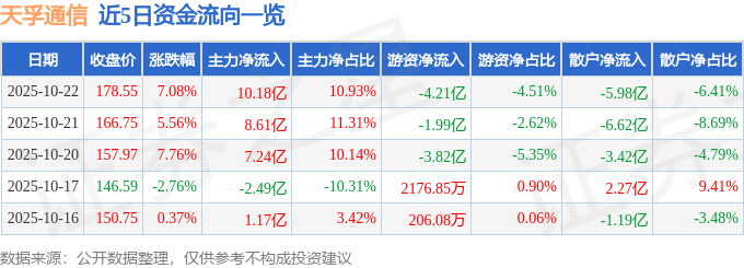 证券之星消息,截至2025年10月22日收盘,天孚通信(300394)报收于178.55元,上涨7.08%,换手率6.82%,成交量52.9万手,成交额93.19亿元。
