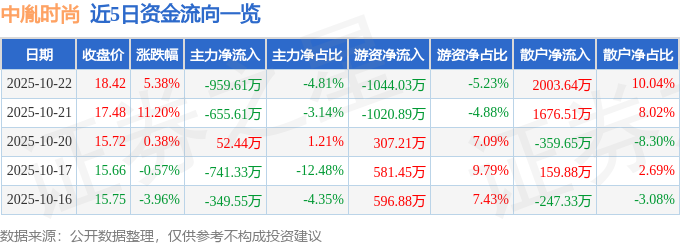 证券之星消息,截至2025年10月22日收盘,中胤时尚(300901)报收于18.42元,上涨5.38%,换手率4.55%,成交量10.91万手,成交额2.0亿元。