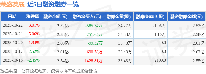 荣盛发展融资融券信息显示,融资方面,当日融资买入3989.14万元,融资偿还4574.87万元,融资净偿还585.74万元。融券方面,融券卖出9500.0股,融券偿还2.01万股,融券余量34.27万股,融券余额58.6万元。融资融券余额2.52亿元。